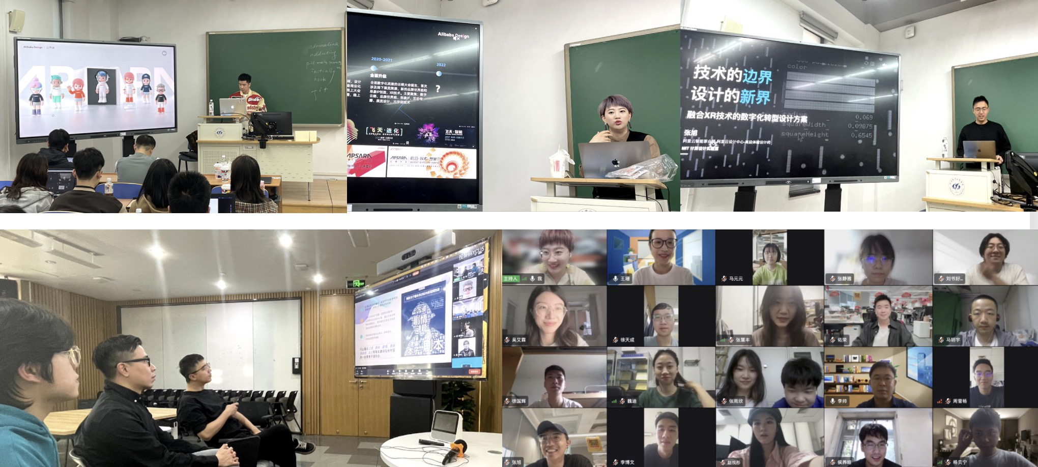 课程采用模块化授课方式,围绕课程内容模块和研究主题,校企导师团队以专题形式进行授课,其中来自阿里云智能设计部、达摩院XR实验室的设计、技术专家围绕VR/AR领域前沿知识和设计理念,从设计、技术不同角度带来了8个精彩的主题分享。来自阿里云智能设计部的杨珊、张旭、郑瑞鹏、张师华、刘书好老师分别带领1个跨学科小组,与两位任课教师全程共同指导课程作业。