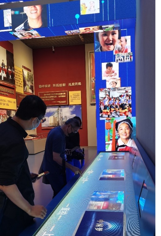 新媒体学院团队在学习党史的过程中,从艺术与新媒体传播的专业角度,仔细学习展览设计和内容传播的技术与体验方式。我院数字媒体艺术专业的老师在“中国梦”交互体验区提醒师生可以现场即时拍照,上传到交互展示区。