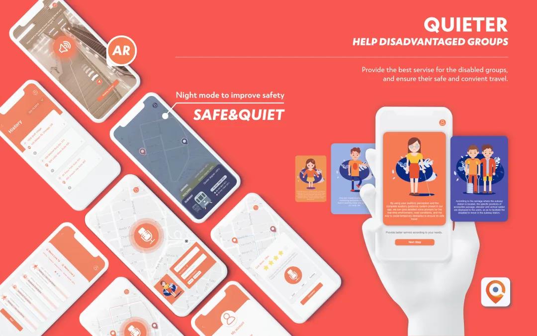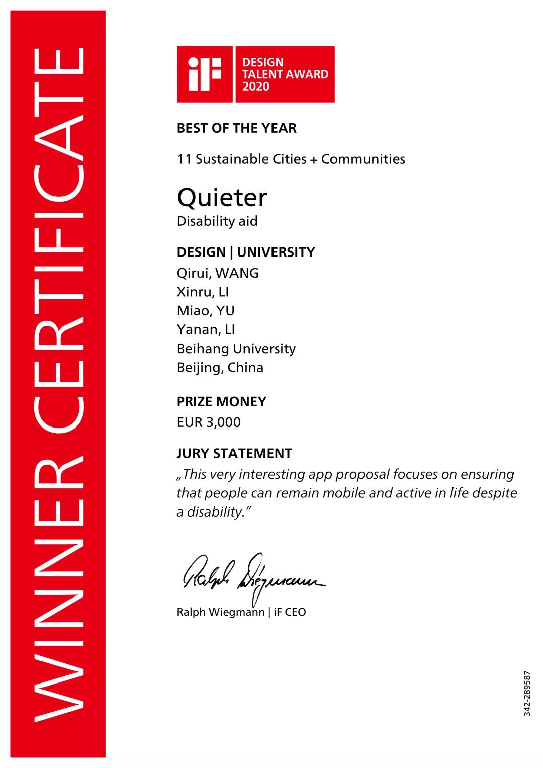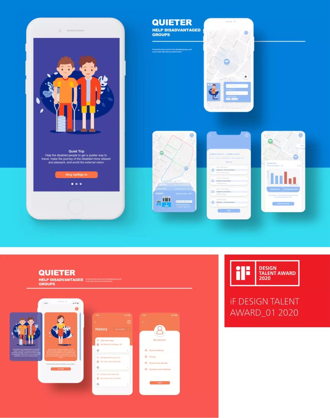 设计作品“Quieter”为其中的“可持续城市和社区(Sustainable cities and communities)”主题进行设计。该项目的目标是“到2030年,因公共交通系统的不断扩大,旨在为所有人(特别是弱势群体、妇女、儿童、残疾人和老年人)提供安全的、可支付的和可持续的交通系统方案,并改善道路安全。”该主题希望探讨设计在解决城市交通的可持续性和提高人类福祉中的相关价值。在全球超过一万件的设计参赛作品中,最终仅有7件作品荣获iF年度最佳奖(BEST OF THE YEAR)。我校成人小说 的本科生王麒瑞、栗歆茹、于淼、李亚男小组在众多参赛者中突出重围,斩获了年度最佳奖(BEST OF THE YEAR)并获得丰厚奖金。iF设计大赛(iF DESIGN AWARD)的评审团在其获奖评语中这样写道:“这个有趣的移动应用设计项目保证了残疾人在生活中的可移动的(mobile)能力和保持活动的(active)能力。”