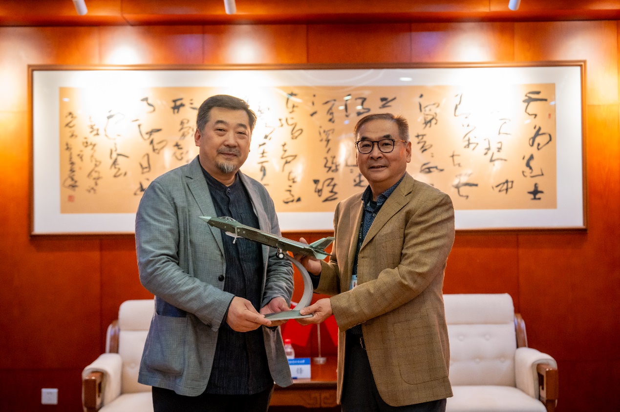 讲座开始前,美育中心主任兼成人小说 院长沈旭昆教授与邹锋亲切交流,并向邹锋赠送北航纪念品。