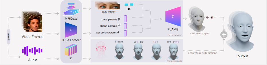 论文研究工作聚焦于三维面部动画算法的优化。发现当前三维面部动画工作存在模态单一、渲染效果欠佳和序列动作生成不稳定等局限性,据此优化了各先进工作动画生成算法,提出了一个多模态三维面部动画技术架构(见下图):本项目利用注视方向识别模型以获取基于头部姿态的注视方向数据,并对根据图像重构三维面部头部姿态和面部表情模型的生成结果进行了优化,与针对音频生成的唇形顶点序列相结合。该框架使用视频和音频输入,重建出包含头部姿态、面部表情、自然唇动和注视方向的全面、自然的三维面部动画。通过用户研究,在不同的动画生成方法上进行实验,验证了多模态框架对提升动画生成任务视觉感知效果的有效性。