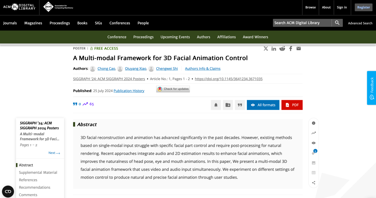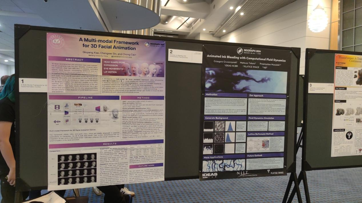 2024年7月,我院曹翀老师指导的2022级本科生石城玮和2021级本科生肖秋瑒(计算机学院)发表的科研论文“A Multi-modal Framework for 3D Facial Animation Control”(多模态三维面部动画控制机制)正式被计算机图形学顶级会议SIGGRAPH(Special Interest Group on Computer Graphics)收录,在大会上进行Poster展示,并入选SIGGRAPH 2024 Techmical Papers sesions(技术论文展示环节),标志着学院学术水平和影响力进一步提升。