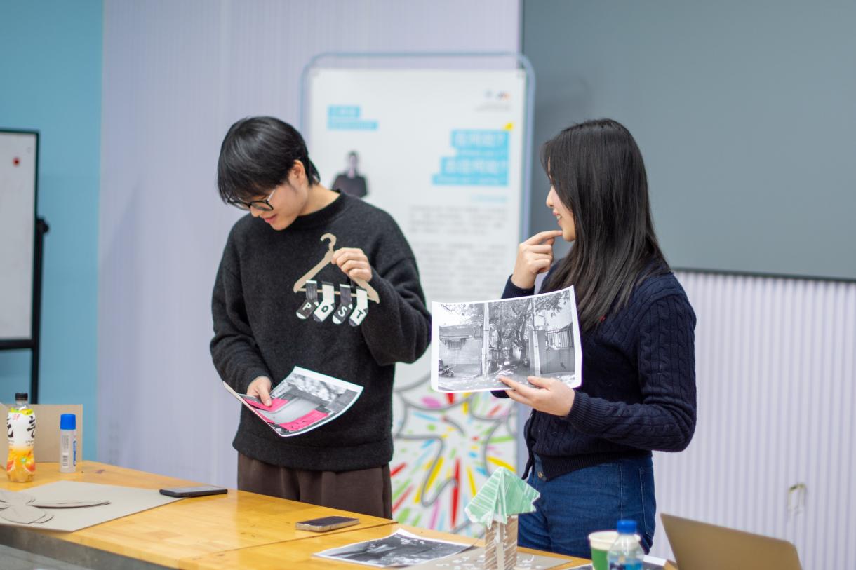 随后,工作坊活动正式开始。在场学生通过抽签分组,每两人一组,经过讨论选定特定真实地点,并探讨导识元素的设置位置及呈现形式,旨在构建一个连续的信息链条以实现有效的信息传递。小组成员需在现场打印选定地点的平面图或照片,并明确导识目标(例如寻找特定地点或物品)。学生们利用打印纸、硫酸纸、硬纸板等材料进行设计实践,通过图像形式展现设计问题及方案要素,并制作模型。最终,各小组需用全英文对设计方案进行快速展示。