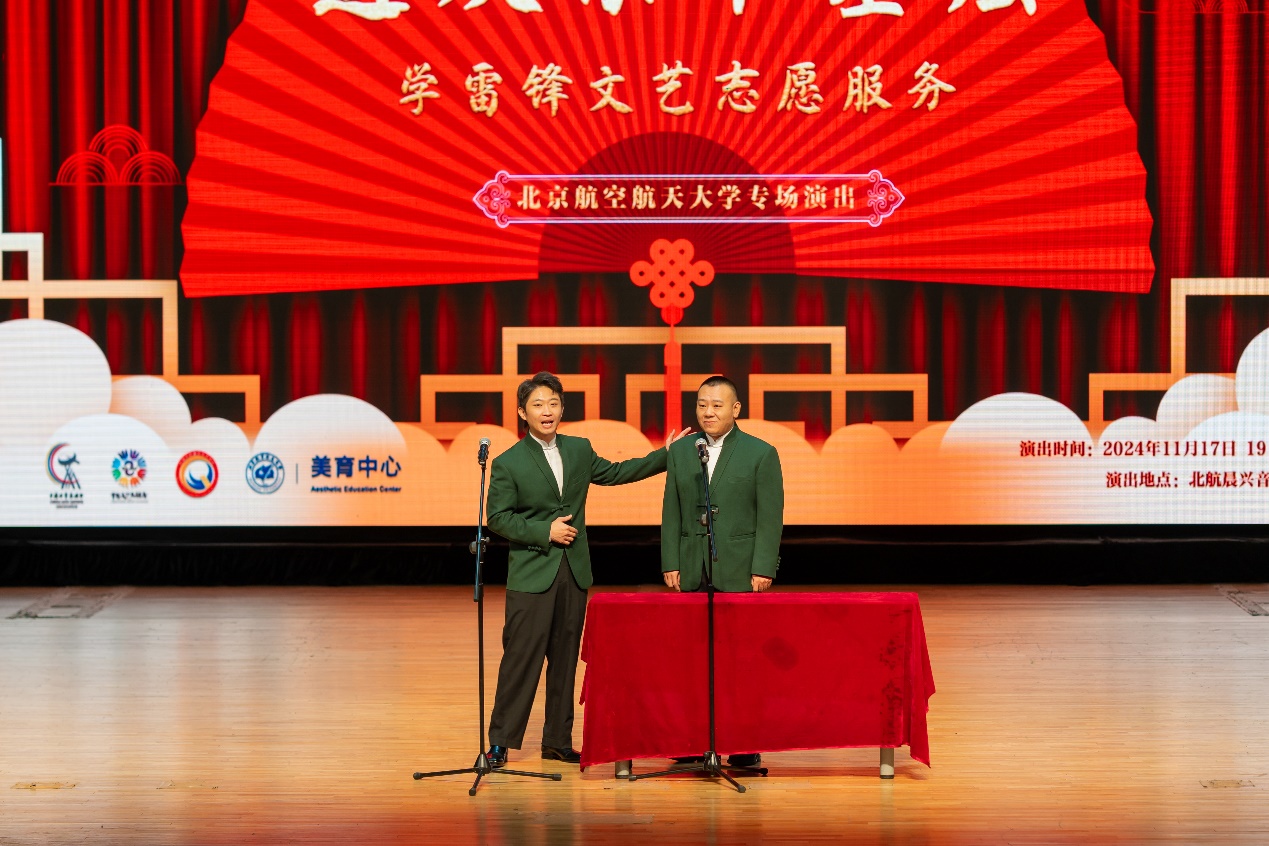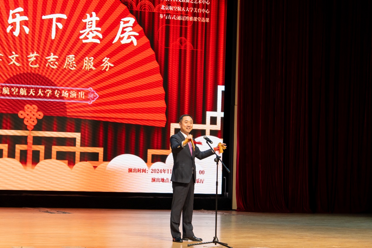 演出开始前,我校党委副书记程波、党委宣传部部长李建伟、美育中心主任兼成人小说 院长沈旭昆、成人小说 党委书记苗建军、美育中心副主任宋泽惠在贵宾室接待了中国曲艺家协会分党组书记、驻会副主席杨发航,中国文联文艺志愿服务中心副主任、中国文艺志愿者协会副秘书长吴艳华,中国文联曲艺艺术中心主任刘志龙、副主任姜博及韩胜利,并赠送了北航特色纪念品。