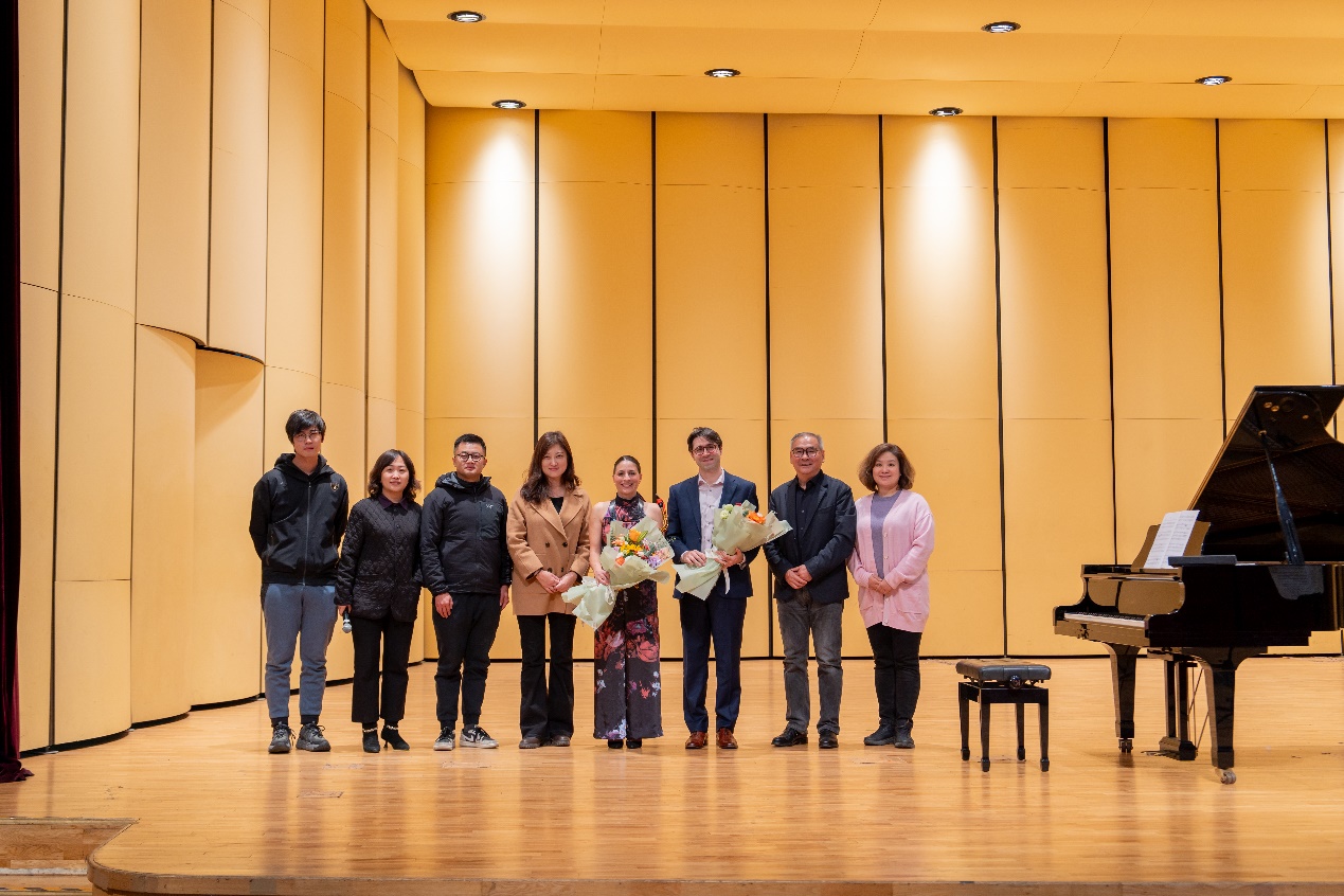 演出结束后,美育中心主任兼成人小说 院长沈旭昆、美育中心副主任宋泽惠等与演奏家合影留念。