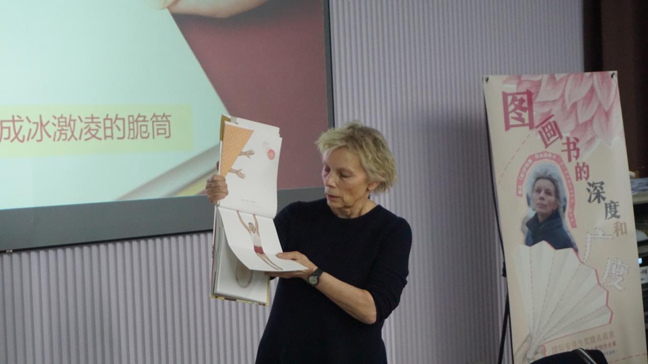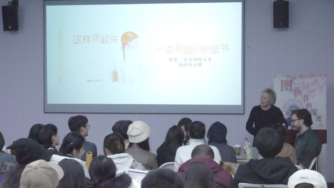 在讲座中,伊娃娜女士首先对在场师生的到来表达了谢意,并谦虚地表示愿意与大家共同进步。她通过分享自己的代表作品,如《空》《有麻烦了!》《这样折起来》和《普通的书》,深入浅出地讲解了自己围绕图像与空间展开的图画书创作思路与表现方法,带领观众们进入了一个极具想象力且充满人文关怀与哲理思辨的艺术世界。她的讲解不仅拓宽了师生的专业视野,更为大家提供了宝贵的创作经验和启示。